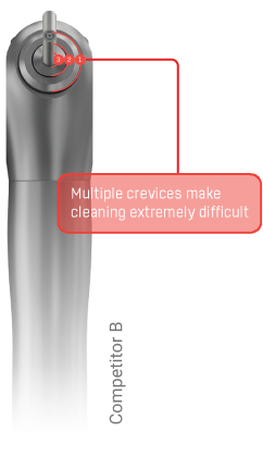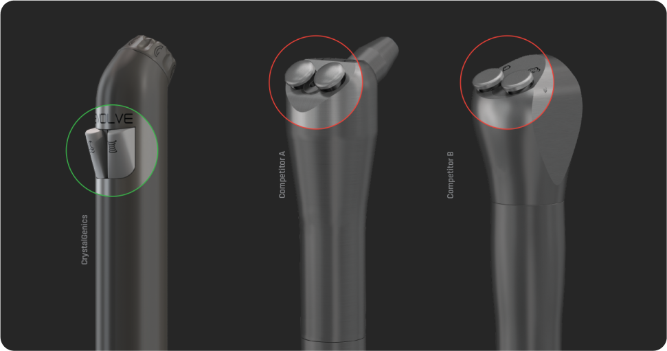 The CrystalGenics buttons are designed to maintain and keep the DHCP's hand in a natural position while working in the patient's mouth. Each button gives a much desired tactile feedback. The thumb rests comfortably between the buttons and responds to either function effortlessly.