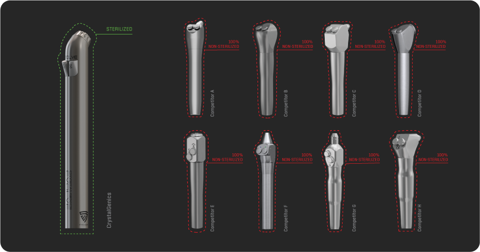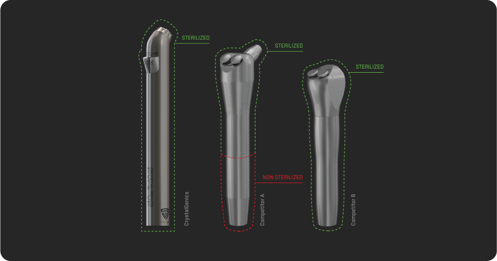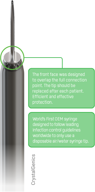 Increases the safety of every patient. Using CrystalGenics will reduce risks in cross-contamination while reducing liabilities following best practices and recommendations. Our system increases patient safety versus non-autoclavable, non-sterilizable air water syringes and tips.