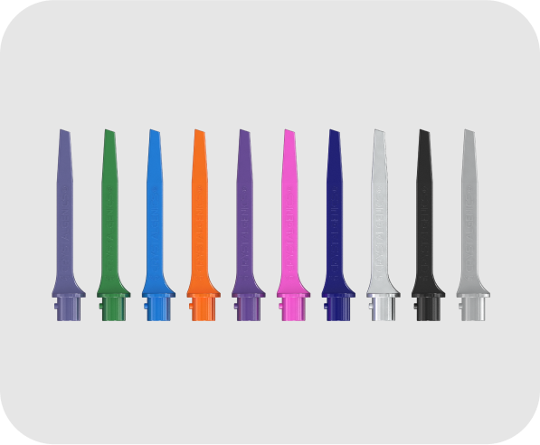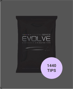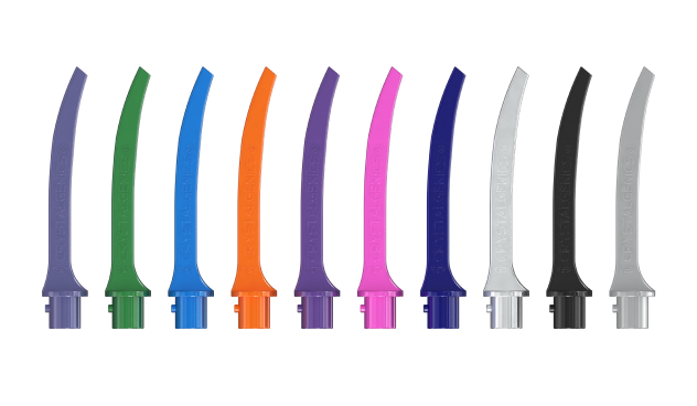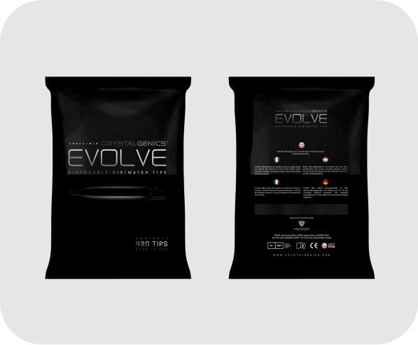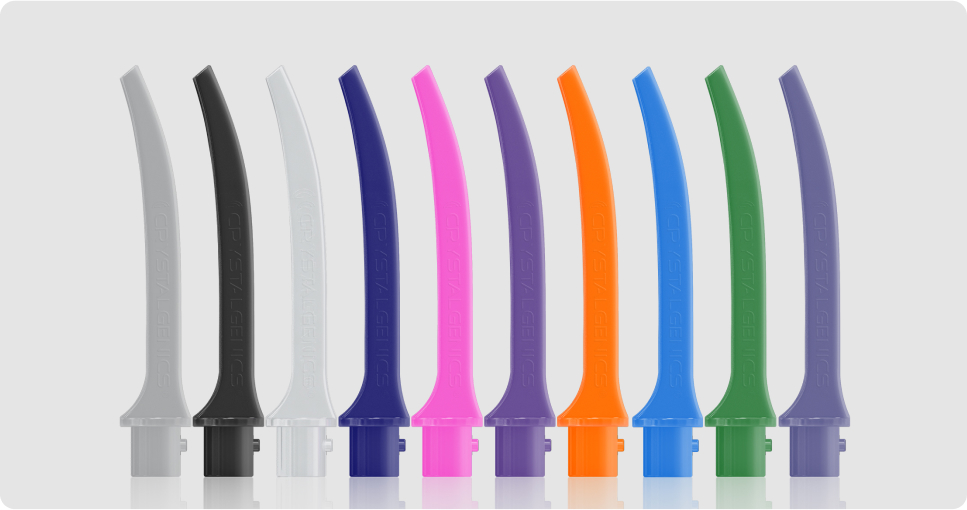 The CrystalGenics Tips are available in two profiles, straight and angled, two materials, bio-resin or plastic resin, and ten designer colors. Offices can order the air water syringe tips and select which options work best for their dental office needs. The air water syringe tips come in packs of 480 tips or a combo kit of 1440 tips. CrystalGenics air water syringe tips are single-use and not to be reused.